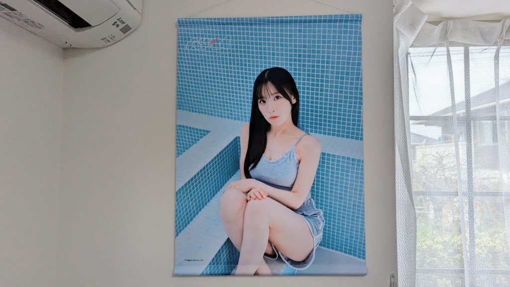 扱いやすいのもいい。紙のポスターだと折れとか気にして慎重に取り扱わないといけないけど、布だからその心配がないし。あと、布でもひもが付いてない布ポスターだと、壁に飾る時ひと手間かかるけど、タペストリーならひもが付いてるから、画鋲をぷすっとさした壁にひょいっと引っかけるだけでいい。収納する時もくるくる巻くだけでいいから、これまた楽でいいですね。