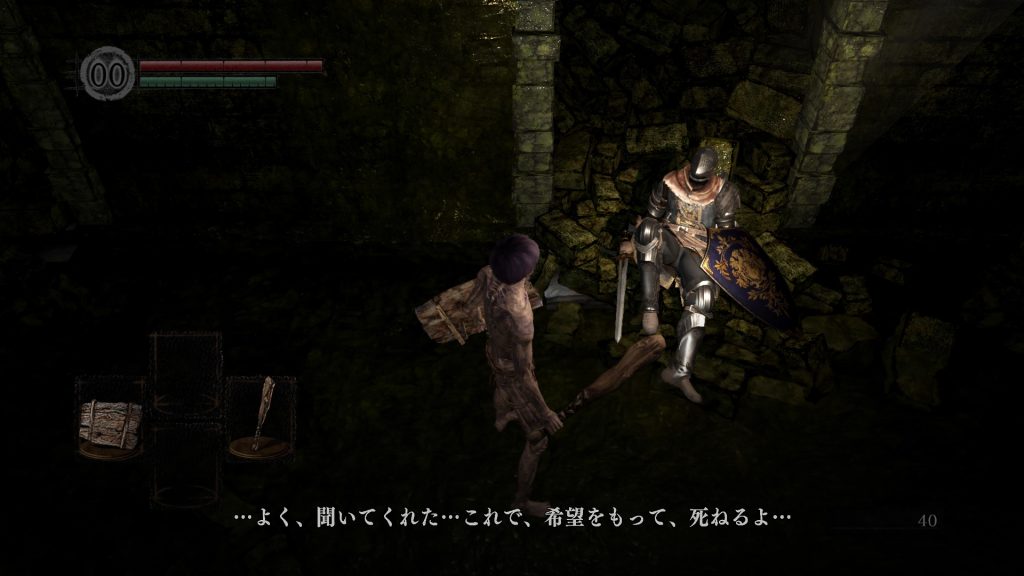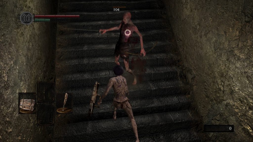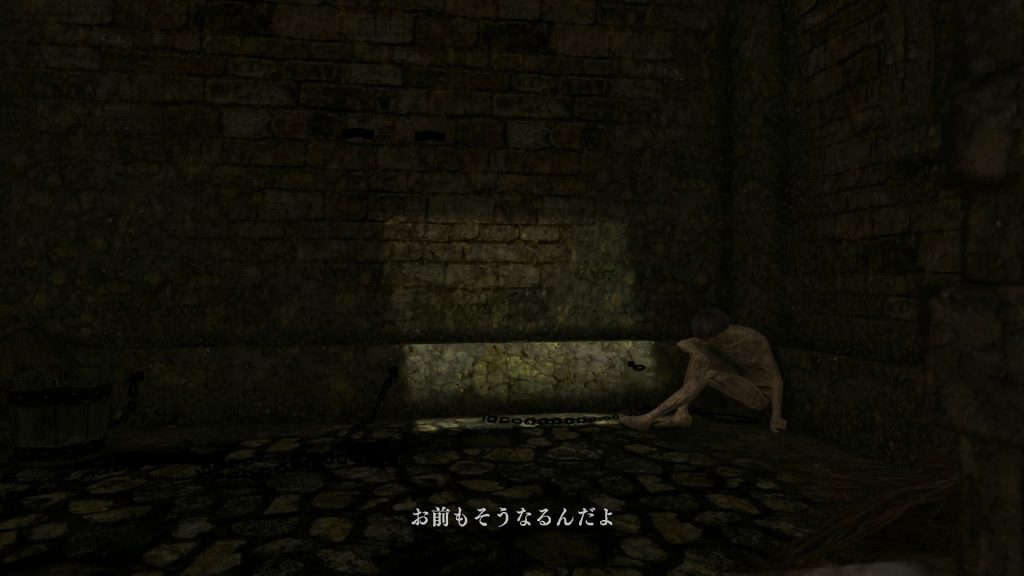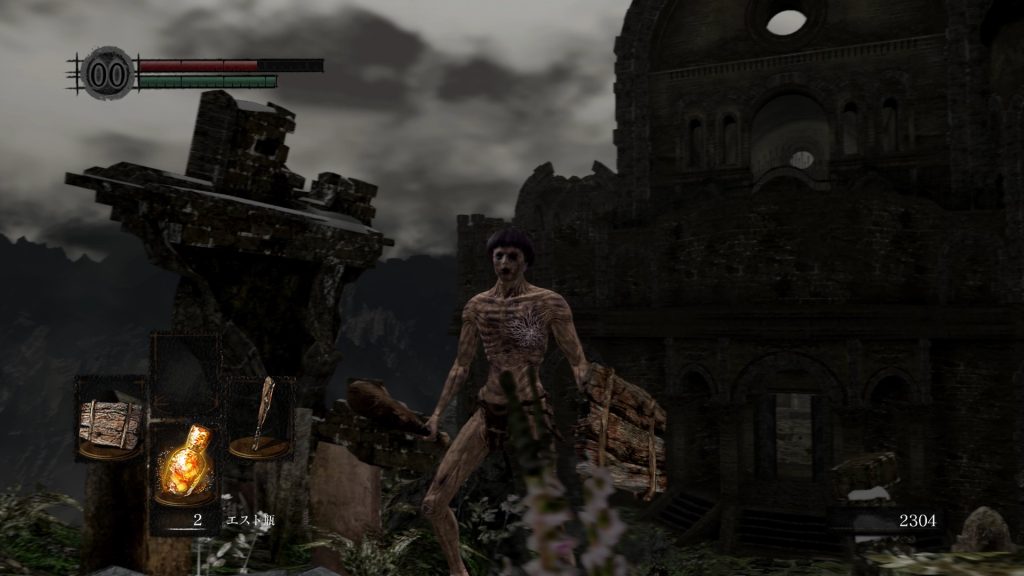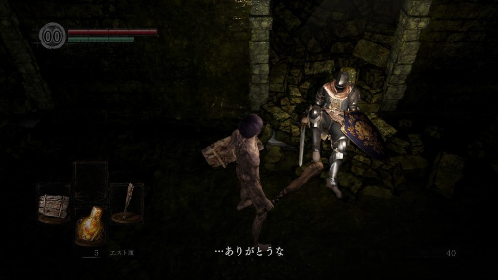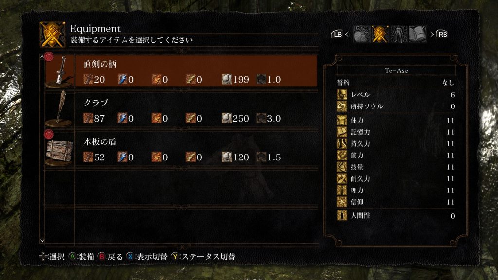 コツコツやってると、木板の盾とクラブを見つけた。装備する。でも思った。こいつの初期装備は「直剣の柄」。「柄」だけでバケモノと戦わされてたのか。悲しさがこみ上げる。