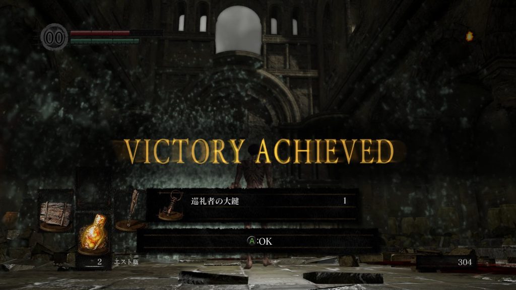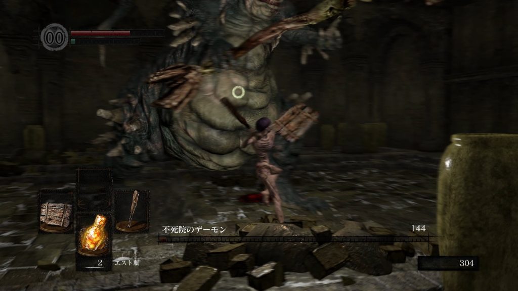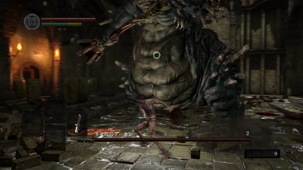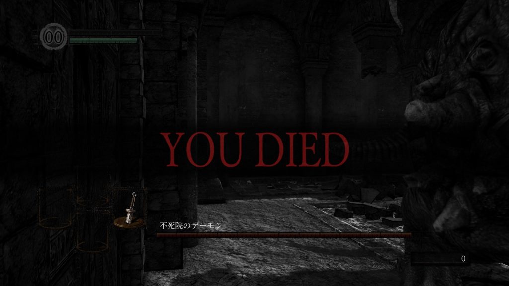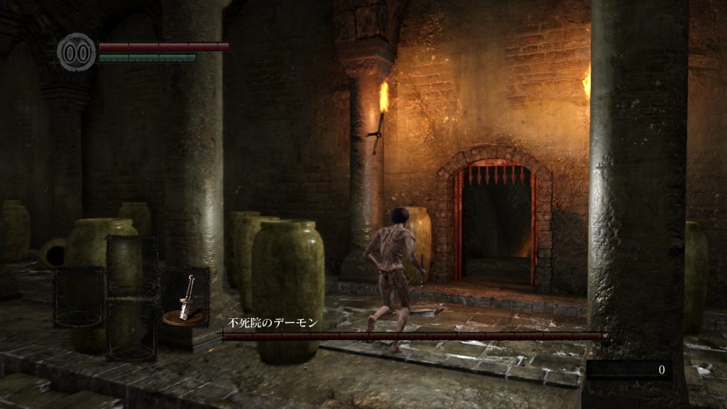 不死院のデーモン。正規の攻略法は耳にしたことがある。一旦脇の扉に逃げるのだ。でも、ワンチャン倒せるんじゃないかって試してみた。